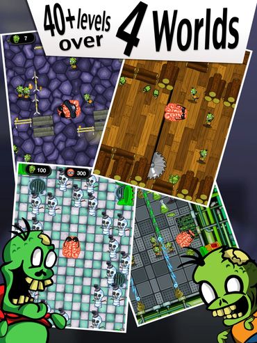 Save the 5 monstrous worlds, each complete with their own set of levels where you must break items in order to squish zombies with your oversized frontal lobes. Bouncing off walls, avoiding acid pools, dodging lumber saws, and sliding around on ice are just a few of the things you will need to do to. Featuring a variety of different enemy types each with their own behaviors who are all wanting to taste your intellect. When you are done, you then get to grind everything you've smashed together for mulch coins to give to your assistant Toady to upgrade your brain.